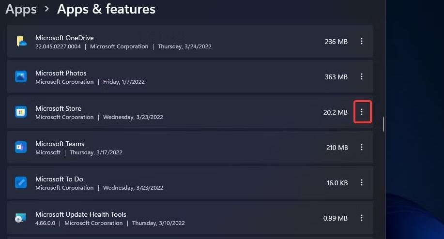در مرحله بعد، روی دکمه سه نقطه برنامه Microsoft Store کلیک کنید