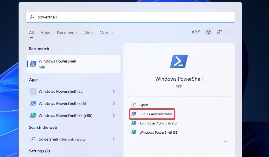 2.اجرای به عنوان سرپرست را برای نتیجه جستجوی PowerShell انتخاب کنید تا آن برنامه راه اندازی شود.