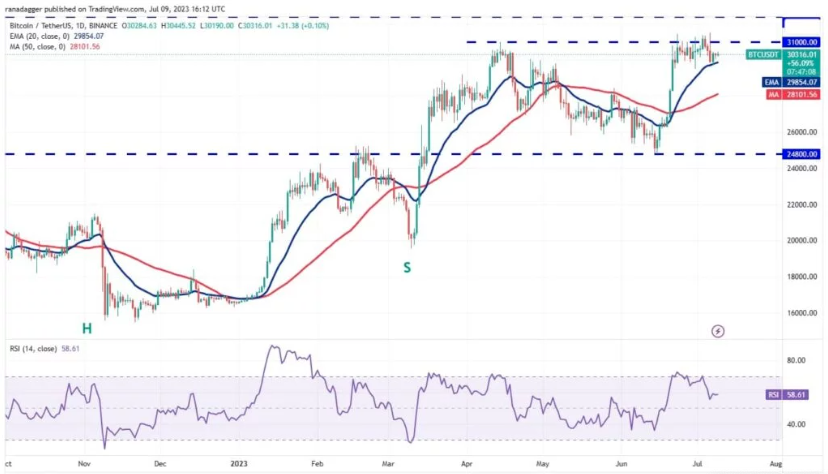 قیمت بیت کوین بین میانگین متحرک نمایی ۲۰ روزه (خط آبی در نمودار پایین، ۲۹٬۸۵۴ دلار) و مقاومت ۳۱٬۰۰۰ دلار در نوسان است. این امر نشاندهنده عدم اطمینان در بین گاوها و خرسها در مورد جهت بعدی قیمت است.
