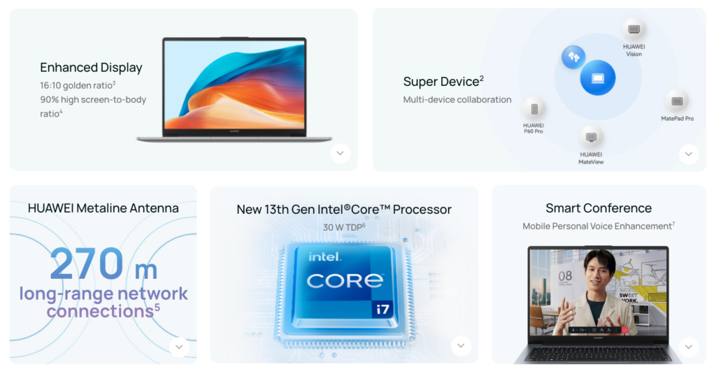 لپتاپ جدید هواوی از پردازنده اینتل نسل سیزدهم Core i5-13420H با ۱۶ گیگابایت رم LPDDR4x و ۵۱۲ گیگابایت SSD از نوع NVMe PCIe استفاده میکند. این لپتاپ با ویندوز ۱۱ عرضه میشود.