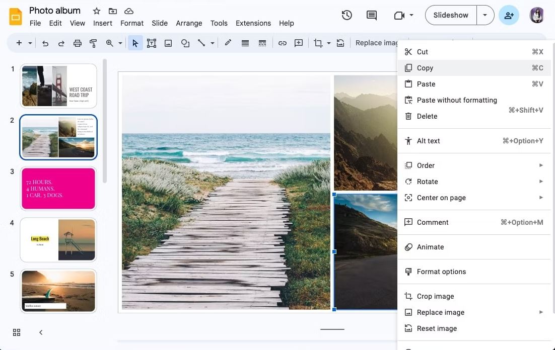 ارائه Google Slides خود را باز کنید، روی تصویر کلیک راست کرده و Copy را انتخاب کنید.