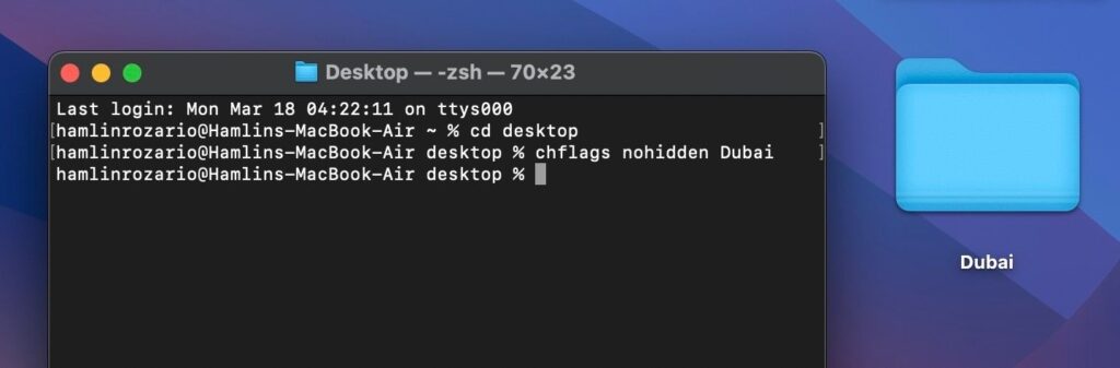 [نام فایل] را با هر فایل یا پوشه ای که می خواهید پنهان کنید جایگزین نمایید.به عنوان مثال، مای با تایپ chflags nohidden Dubai، پوشه ای به نام «Dubai» را بازگشایی کردیم.