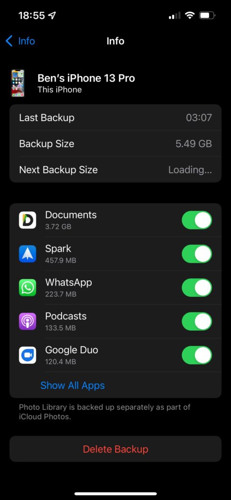 برای سفارشی سازی داده های برنامه ای که دستگاهتان در پشتیبان گیری خود دارد، به Settings > [نام شما] > iCloud > Manage Account Storage > Backups بروید. روی دستگاه خود ضربه بزنید و همه مواردی را که در iCloud پشتیبان گیری می‌کند، مشاهده خواهید کرد. برای حذف و صرفه جویی در فضا، نوار لغزنده برنامه را خاموش کنید.