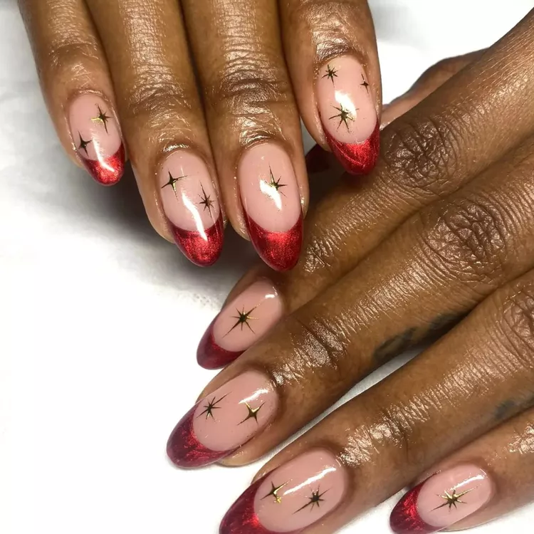 اگر دوست دارید ناخن های خود را با تعطیلات خاص هماهنگ کنید، این ست کریسمس برای شما ساخته شده است. این خیلی در چهره شما نیست، و ما دوست داریم که چگونه این هنرمند ناخن یک مانیکور کلاسیک فرانسوی را با طرح های طلایی ترکیب کرد. می توانید ستاره های طلایی خود را با دست نقاشی کنید یا از برچسب های ناخن استفاده کنید.